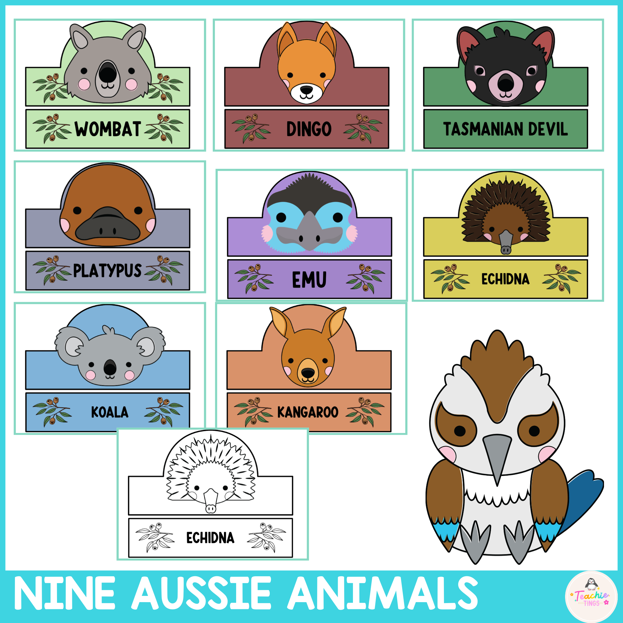 - Nine different animals (koala, kangaroo, platypus, echidna, Tasmanian Devil, emu, kookaburra, dingo, wombat)