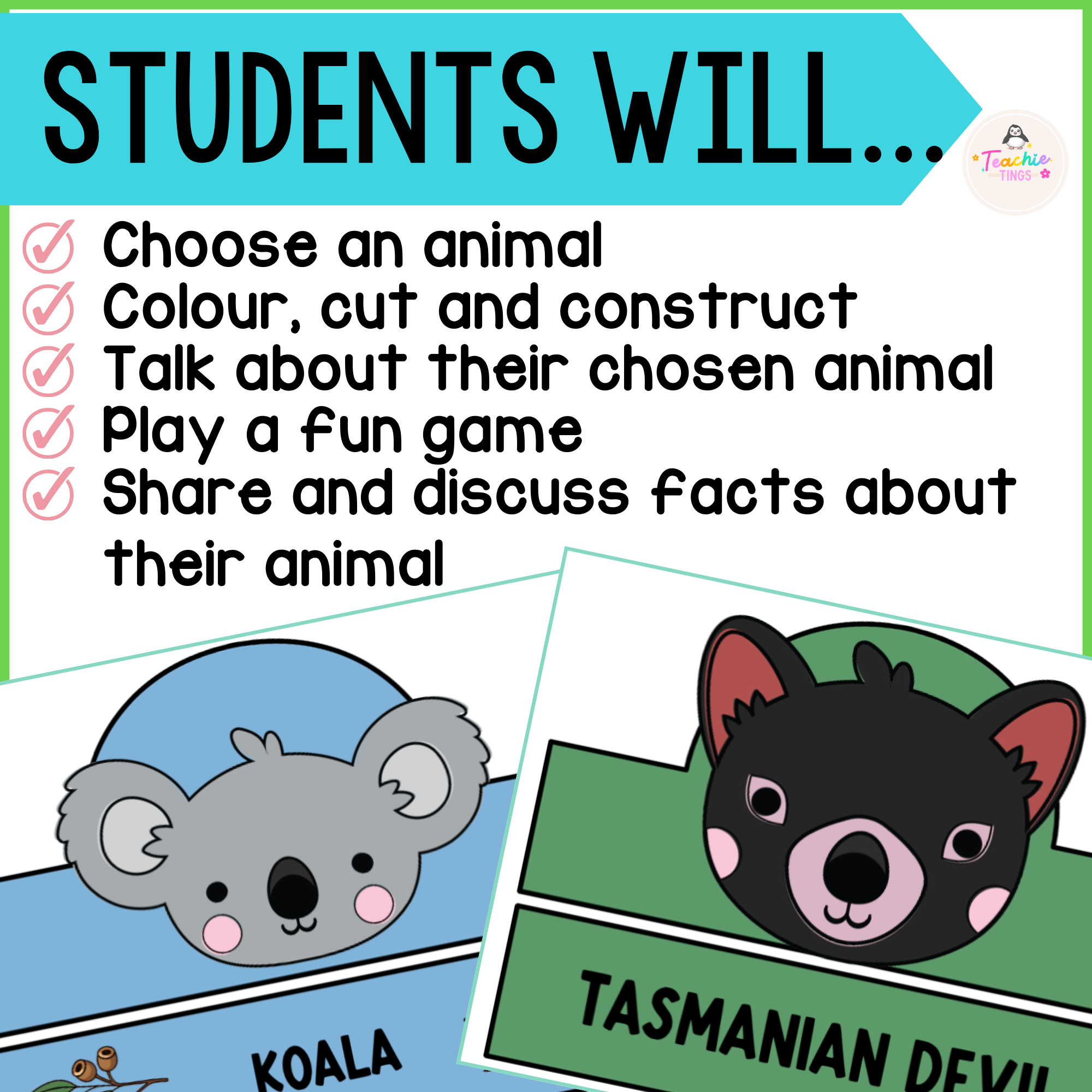 Play games such as ‘Hot Seat’ or ‘Who Am I?’ using these headbands. Students can ask questions based on Australian animal facts, such as appearance, diet, habitat, lifecycle, special features and interesting facts!