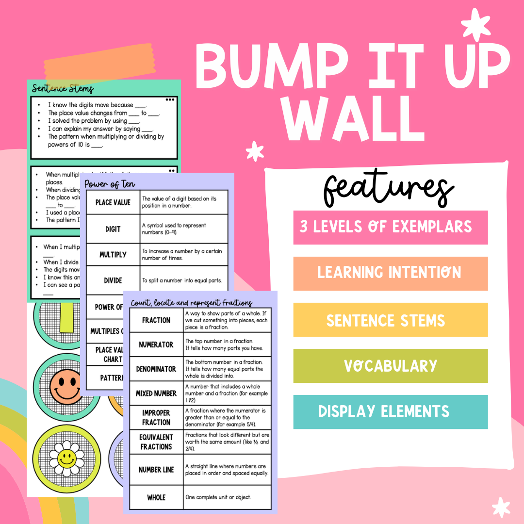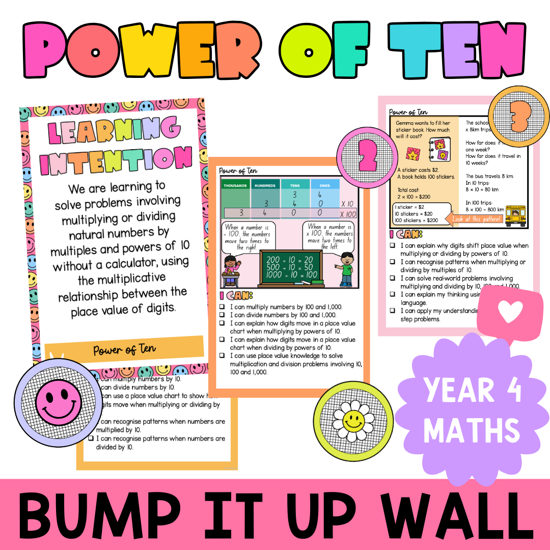 Make multiplying and dividing by powers of 10 visible and easy to understand with this bright and interactive Bump It Up Wall, aligned with the Australian Curriculum v9. Students can clearly see what success looks like as they move from multiplying and dividing by 10 to understanding patterns and explaining how place value changes when working with 10, 100 and 1,000.