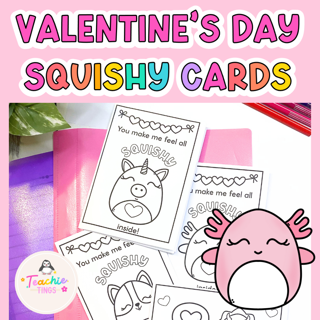 These Valentine’s Day Squishy Cards feature adorable, soft-style characters (inspired by the squishy toys kids adore!) and are designed as a simple two-fold card, making them perfect for classroom Valentine’s Day celebrations.